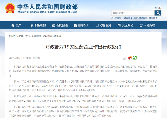 4月12日,财政部门发布会计信息质量检查公告,依据会计法,对财政部有关监管局检查的19家医药企业作出行政处罚。公告显示,被处罚的19家医药企业存在着使用虚假发票、票据套取资金体外使用,虚构业务事项或利用医药推广公司套取资金,账簿设置不规范等违规行为。
