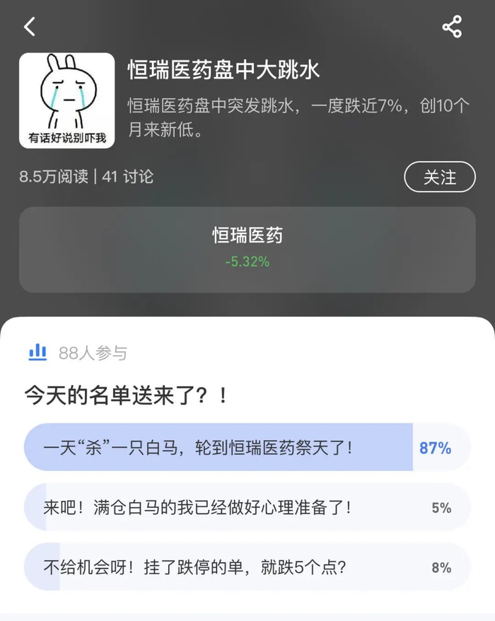 原本以为白马股就稳了,没想到照样被割韭菜。从顺丰、到昨天的中国中免,几乎每天都有白马股暴跌。“白马祭天,法力无边”,今天轮到“药茅”恒瑞医药祭天了。