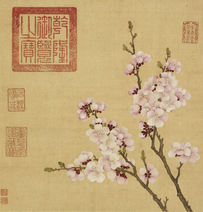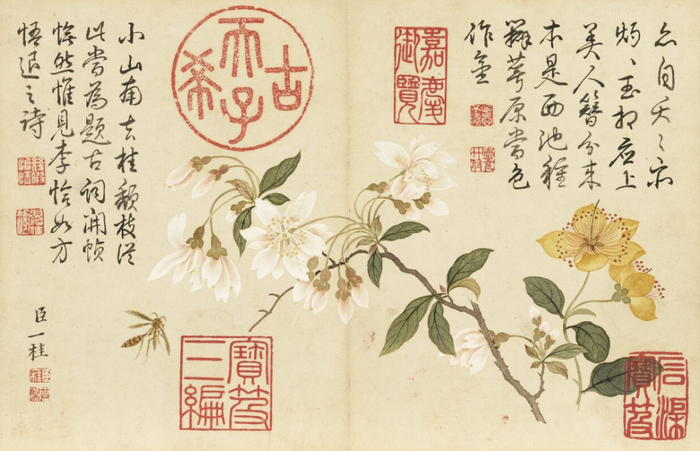 也因梨花、李花的形貌相似,字音相近,所以容易被错认。比如黄居寀的《梨花鹦鹉图》实则应为《李花鹦鹉图》。