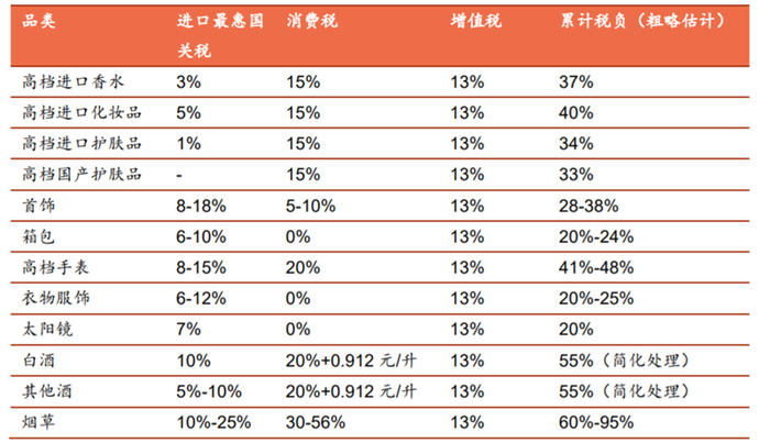 那么减免的三种税率到底有多少呢?我国针对不同的免税品类进行了分类, 以进口高端化妆品为例,关税5%,消费税15%,增值税13%,综合下来税负约40%,箱包的税负在20%-24%,而白酒和烟酒的综合税负则更高,超过了55%。
