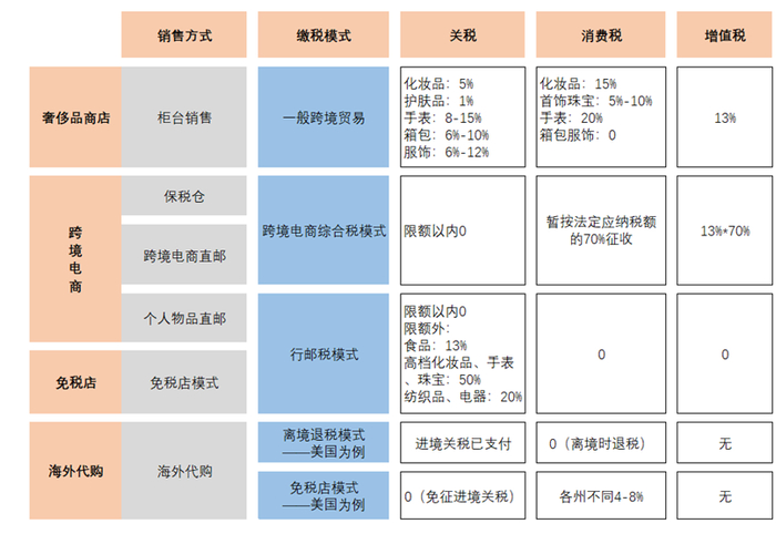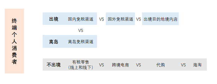 在不出境的情况下我们也可以通过专柜、跨境电商、海外代购进行商品购买,下图将他们与免税销售放在一起进行了比较。