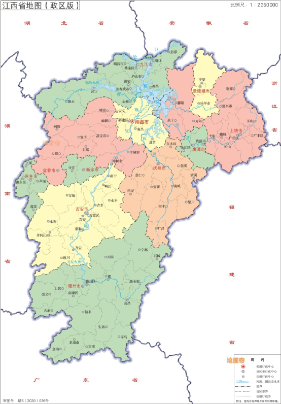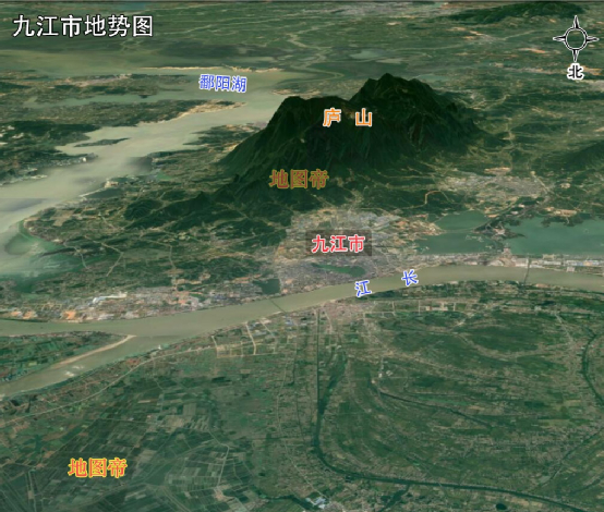 以万里长江为界,九江市西北邻湖北省黄冈市,东北邻安徽省安庆市;东北陆地与安徽省池州市为界,西北以幕阜山为界与湖北省咸宁市相邻。九江市南边是鄱阳湖和江西省会南昌市,东南是上饶市,西南是宜春市。九江市南北窄,东西宽,南北宽约140公里,东西宽约270公里,面积很大,约1.88万平方公里。九江西北有阜山,西南有九岭山,修水穿境而过,汇入赣江,整体地势南北高,中间低。九江还有一座非常著名的山,即庐山,“不识庐山真面目,只缘身在此山中。”说的就是它。