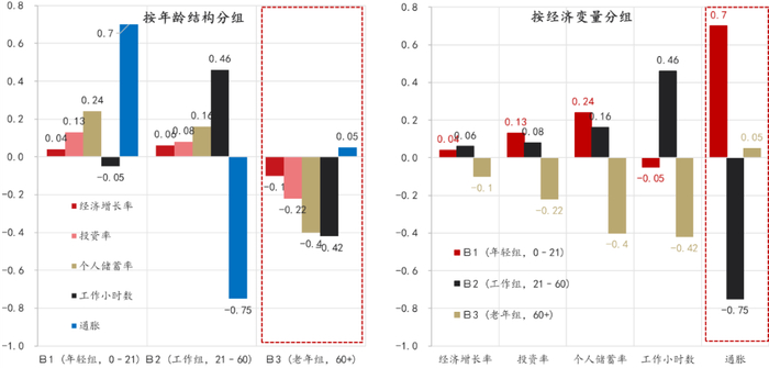 人口结构兼具供给侧和需求侧双重含义,因为不同年龄段人口的生产、消费、投资和储蓄行为是不同的。老龄人口对投资、储蓄、GDP增长的影响都是负向的,对物价有正向影响;劳动年龄人口与之正好相反。