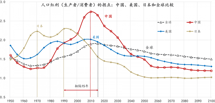 道路施工只有在高峰期时才能导致严重的交通堵塞,原因在于,非高峰期时,其他道路可以分流。类似地,由于日本人口红利的拐点约早于全球拐点15年,其国内的劳动力短缺状况可由其他国家弥补(图4)。由于日本对移民始终持保守态度,这又主要是通过对外直接投资实现的。