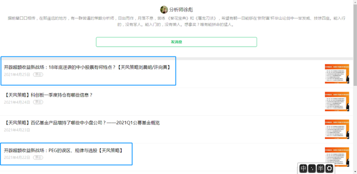 这里的专业基金研究类公众号指的是证券公司投研团队的公众号,他们会将发布的专业证券研究报告转到公众号上进行二次发布。业余基金投资爱好者想朝着专业基金投资者的方向进化,阅读和学习这类研究性文章是很有必要的。尽管对于普通投资者来说,对十几个基金形成深度认知就足以做好投资了,但机构研究者大而全的视野能拓宽我们的眼界,给我们带来新奇与求知的乐趣。