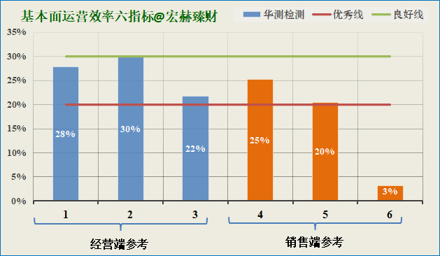 [注]:宏赫臻财独家六指标分析模型,蓝色线为六指标的数值,红色线为优秀水平线,绿色线为良好水平线。低于红色线为优秀。六指标可判别企业轻重资产(经营)性质和折溢价性。据过往经验,一般而言蓝色六指标处于红色线下方越多,企业偏向于轻资产轻运营且大多股价回撤较小和有经常性溢价。也可模糊判断为蓝线值越大企业经营难度越大。