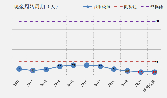 现金循环周期又可称为净营业周期,是考量企业日常运营环节的现金流状况,优先关注那些该指标小于60的企业,负数更为优,表示企业的还款周期远大于存货变现期。警惕该指标大于360的企业。