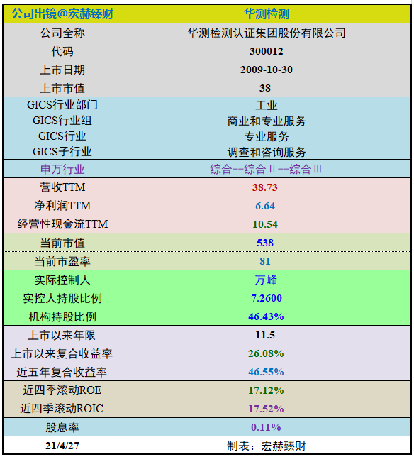 华测检测上市以来市值由38亿增至当前的538亿,11.5年期间年均复合收益率为26.08%。截止当前评测日近五年年均复合收益率为46.55%。