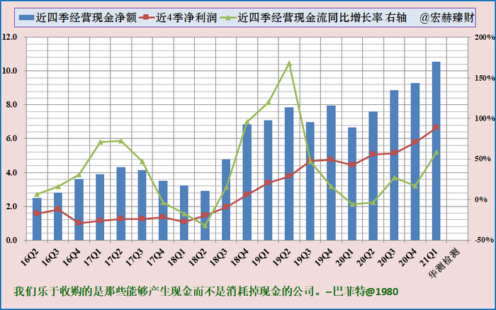 投资者可关注近四季销售和管理费用与毛利润之比持续小于30%的公司(绿线低于下红线为优异,靠近为优秀),具备较高的竞争优势,若30-70%之间为可接受区域(图中红色直线之间),若大于70%需要警惕,说明该公司产生净利润的能力较弱。