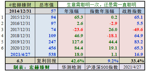 2014年末至今6个整年度段里5年市值增长战胜指数,胜率【83%】,今年以来暂时战胜指数。