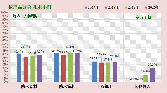 防水卷材和防水涂料毛利率在40%一线。工程施工毛利率在27%一线。