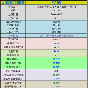 东方雨虹上市以来市值由11亿增至当前的1454亿,12.6年期间年均复合收益率为47.15%。截止当前评测日近五年年均复合收益率为60.10%。