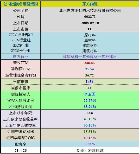 一个成长股的故事:东方雨虹。上市12.6年,市值由11亿增至1454亿,年均复合收益率为47.15%。且在千亿市值之上迎来了高瓴资本、睿远基金、JPMorgan等注明内外资机构定增加码。