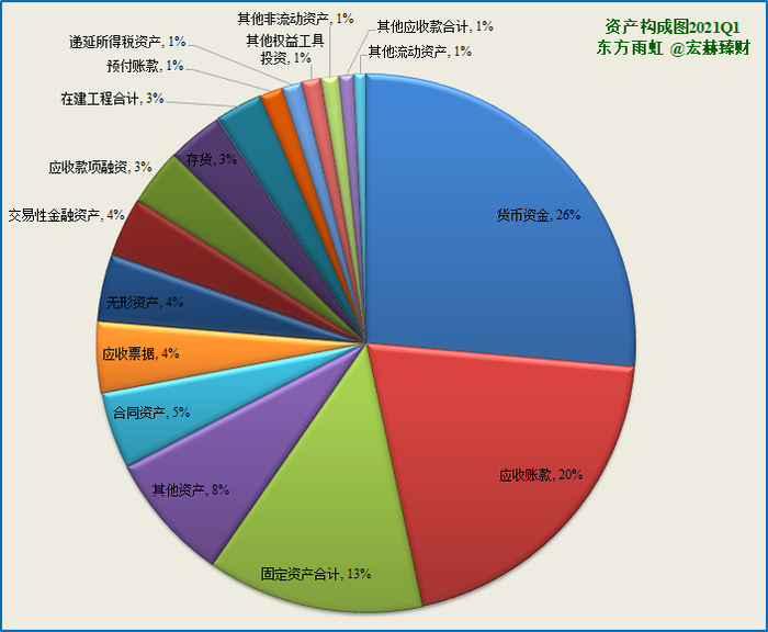 第一大资产为货币资金96.6亿,占比26.2%;2020末占比21.6%(较期初余额增加60.66%,主要原因是由于本公司本期收到定向增发资金所致。)