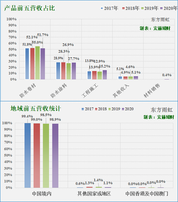 防水材料是公司的主营业务,目前总计营收占比超过80%。其中,防水卷材是公司产品中占比最高的大类,目前营收占比超过50%。