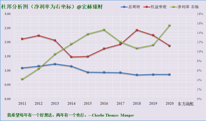 宏赫臻财建议关注未来杜邦指标趋势呈现:【低杠杆或适度杠杆(1.2-3)+周转率接近或大于1且有向上趋势+稳健增长的中高净利率>15%】