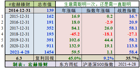 2014年末至今6个整年度段里5年市值增长战胜指数,胜率【83%】,今年以来暂时大幅战胜指数。