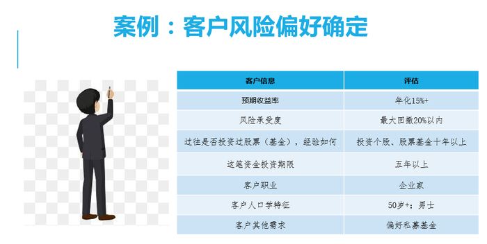 客户希望账户未来三年年化收益率在15%以上,能够承受最大20%的回撤。但往往只有经历过20%回撤的投资人,才知道回撤意味着什么,所以我们需要再考量客户的实际投资经验。这位客户投资个股、股票基金十年以上,经历过2015年、2018年的熊市,应该理解最大回撤20%的真实含义。所以我们会认为,客户的这个收益预期和风险承受度是真实的。否则的话,我们会继续和客户沟通,明确客户的真实的回撤忍受度。同时客户这笔资金是一笔长钱,适合投资股票资产。我们还知道客户是一位男性企业家,50多岁。这些信息有助我们更好的建立和客户的情感连接。在过去投资经验的基础上,客户认为私募股票基金能拿得住,公募股票基金比较难。这一点对于我们形成配置方案也非常重要。