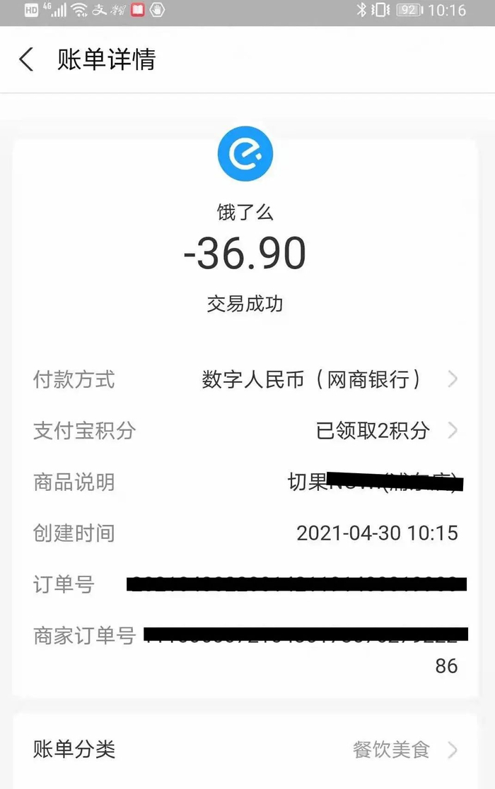 随后,记者通过余先生支付宝App在“饿了么”平台点了几份水果,在支付时同样选择数字人民币(网商银行)钱包,钱包里的数字人民币就能完成线上支付,划转给商家。从消费体验看,不论是线上支付还是线下骑行场景的消费,用数字人民币支付和用支付宝、微信支付中的人民币支付并无差别。