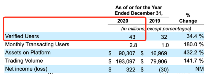 根据加密货币交易平台Coinbase上市前向SEC提交的文件显示,Coinbase 2019年和2020年的认证用户总数分别为3200万和4300万。而2021第一季度,Coinbase的认证用户就增加了1300万,三个月已经超越去年全年增长人数。