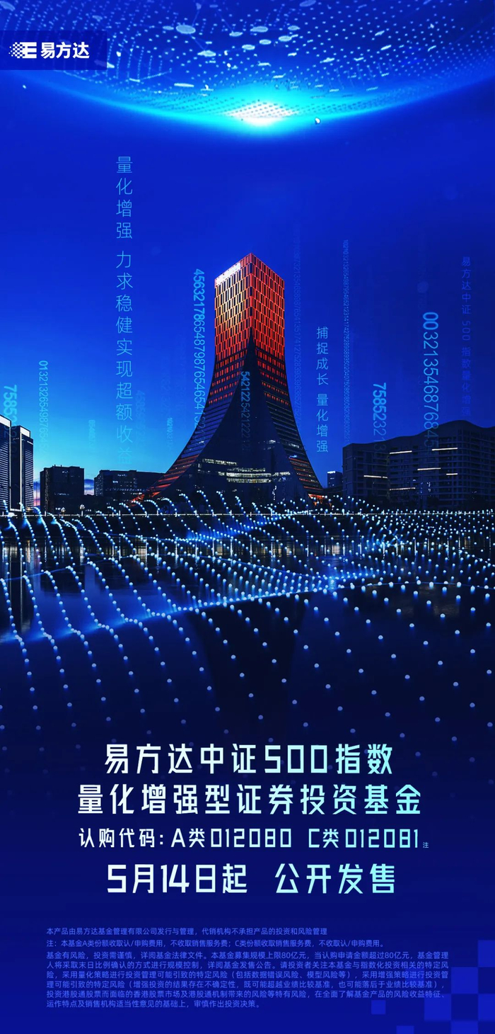 5月14日即将上线的易方达中证500指数量化增强基金(A类012080,C类012081),便着眼于中证500指数,并采用量化增强的方式进行投资管理。