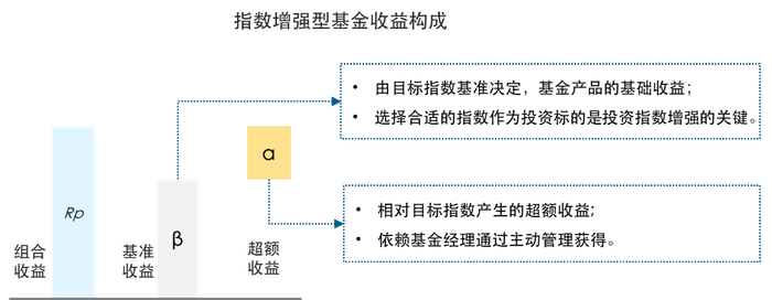 简单来讲,指数增强型基金的主要基金资产会跟踪标的指数,而部分基金资产则通过基金经理的主动管理能力来增厚收益。因此,指数增强基金的收益来源也就分成了两部分:一部分由基准指数带来,另一部分是“增强”方式产生的超额收益。
