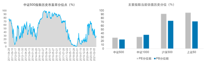 注:数据来自wind,估值时点为2021/4/22,历史分位数取过去10年的区间。以上仅为中证500指数当前市盈率的客观展示,不预示其未来表现,不作为任何投资建议。市盈率=成份股当日总市值/成份股净利润(TTM)总计,市净率=成份股当日总市值/成份股当日最新股东权益 。指数分位数水平是指其当前估值在自指数基日以来的历史中所处的位置。