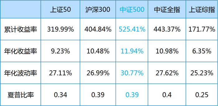 其实中证500指数的长期业绩表现相较于沪深300、上证50、中证全指和上证综指并不逊色,累计收益、年化收益、夏普比率都较高。当然了,“欲戴皇冠,必承其重”,值得一提的是,其波动也较其他主流指数来得更大。