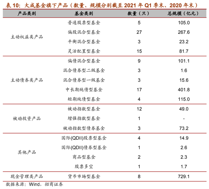 大成基金旗下产品线齐全,涵盖了债券型、货币型、主动管理权益类、指数型、绝对收益型、QDII基金等类别。截至2021年一季度末,大成基金旗下共有118只基金,总管理规模达1,985.6亿元(已剔除ETF联接基金的规模,2020年末规模),排名市场前列。旗下基金业绩大多表现优秀,曾有多只基金获得金牛奖。