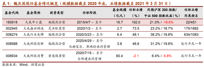 魏庆国2015年4月以来管理大成中小盘偏股混合基金,任职以来近6年产品年化收益率19.6%,相对同期沪深300指数超额收益170.9%,相对同期中证500指数超额收益210.5%,相对中证偏股基金指数超额收益142.5%,在同期451只偏混合型基金中排名第22(本文业绩均截至2021年3月31日)。