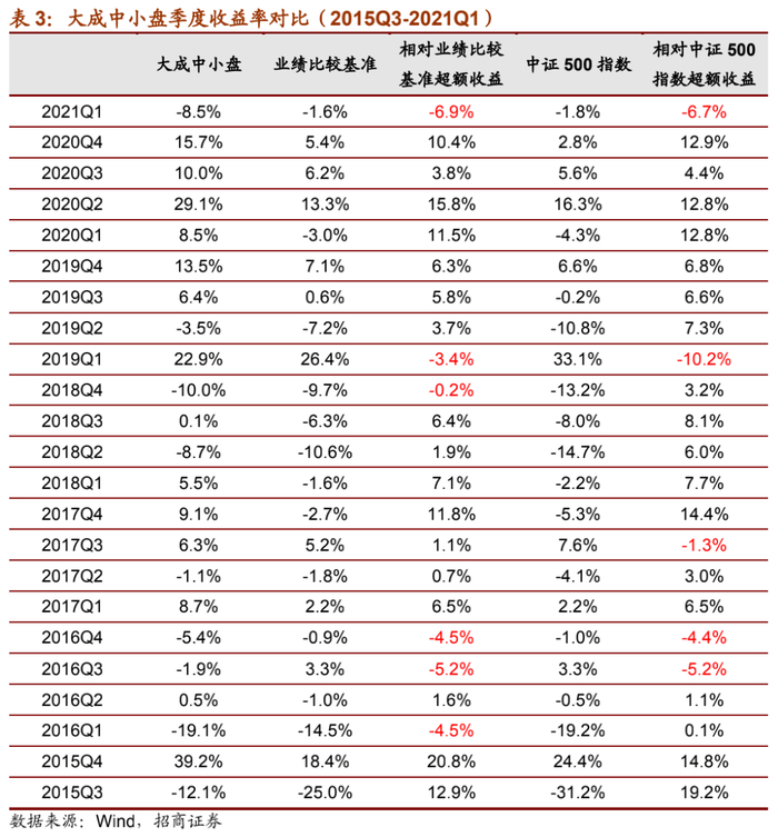 大成中小盘以成长风格为主,因此将产品季度收益率与基金业绩比较基准(中证700指数收益率×80%+中证综合债券指数收益率×20%)与中证500指数进行(成长风格代表宽基指数)比较。
