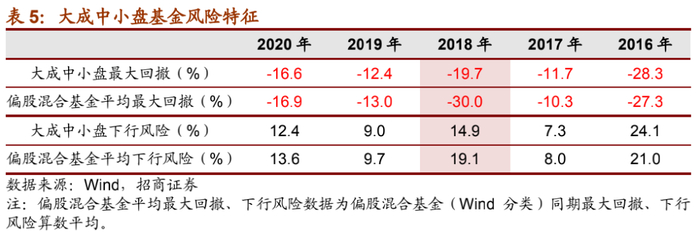 从过往每年度最大回撤、下行风险等风险指标来看,大成中小盘风险控制能力优秀。尤其在2018年熊市中,回撤与下行风险控制表现出色,大幅低于偏股混合基金平均表现。