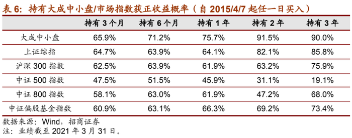 从产品持有体验角度来看,自魏庆国接管大成中小盘起至今,任意一天买入产品并持有一定时间段获取正收益的概率均远超市场指数,且随着持有时间的增长,获正收益的概率逐渐上升。