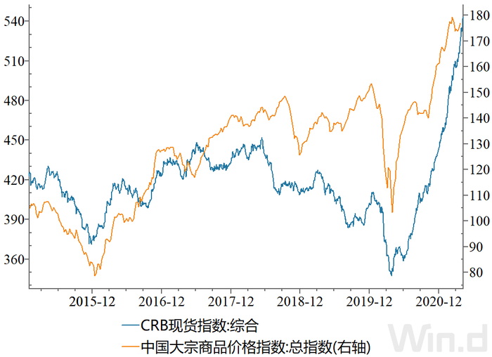 近一周,大宗商品接连突破前期新高水平,无论是有色、黑色、还是能源指数,均创出了新高,尤其是铜铝创了近十年以来的新高水平。Wind数据显示,截止5月7日,CRB现货综合指数为542.92点,较上年同期上涨51.6%。