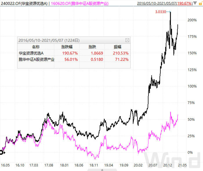 比较近五年,华宝资源优选A与鹏华中证A股资源产业走势看,两者涨跌基本一致,但华宝资源优选A凭借仓位、选股优势回撤控制更好,长周期业绩更突出。