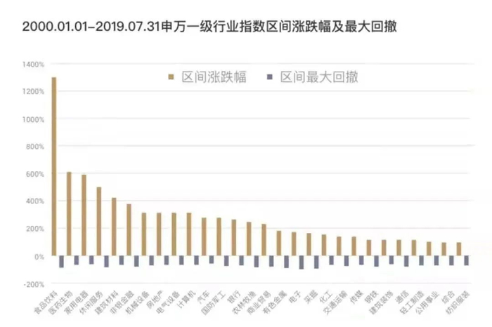在中国,过去20年,消费行业的回报也是高居榜首。从2000年初到2019年7月,申万行业指数涨幅前四名均属大消费,其中食品饮料上涨1300%,医药生物、家用电器上涨了600%,休闲服务上涨了500%。