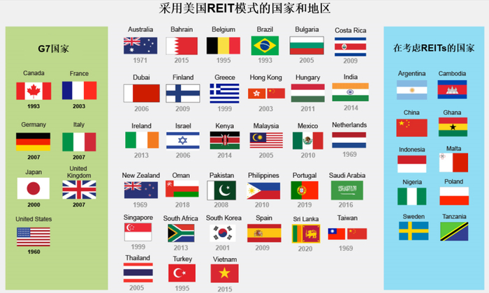 REITs起源于美国,由美国国会于1960年创立,初衷是使得所有投资者、尤其是小型投资者获得产生收益的房地产相关产品。此后,美国REITs经历了蓬勃的发展,其模式被全球许多国家所借鉴,如今有40多个国家和地区(包括所有G7国家和近三分之二的OECD国家)采用了美国REITs的方法。