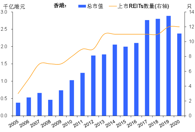 新加坡是亚洲第二大REITs市场,规模约745亿美元,数量为38只,允许跨境投资,为投资全球房地产提供了有效途径。新加坡REITs的特点之一:主要投资标的为境外资产,据REITAS统计,新加坡REITs仅投资境内房地产的比例只有约15%。中国香港REITs市场于2005年起步(规模约332亿美元),虽然数量仅10只,但经营和投资模式较为完善,为亚洲REITs市场树立了标杆。