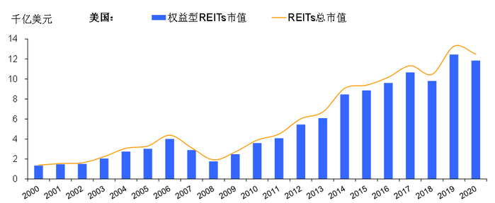 根据Nareit数据,截至2021年3月,美国REITs的总市值约1.35万亿美元,居世界首位。将近1.45亿美国人(约43%的美国家庭)直接或通过共同基金、ETF等方式间接持有REITs份额。
