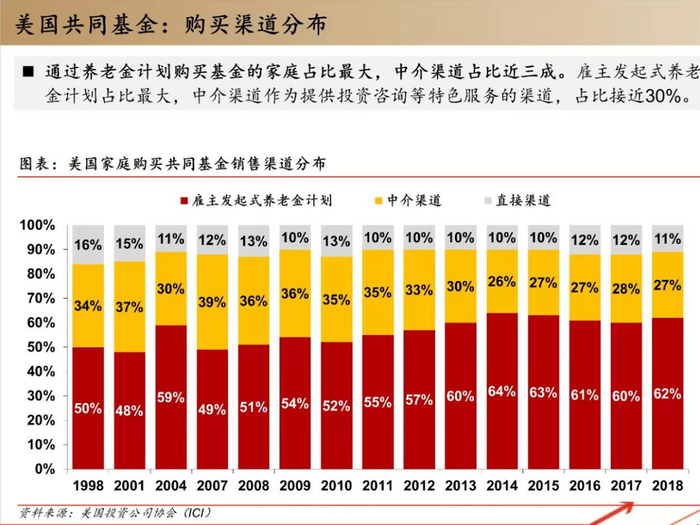 并且,这三种渠道当中的最后一种,雇主发起的退休金计划,则成为了现如今美国最重要的基金购买渠道和美国共同基金(也就是公募基金)的增量资金来源。