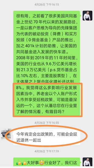 关于第二点,我正好最近问了下业内资深人士,他给的答案是“正在路上,今年肯定会出政策”,如果真的落地并且细节也能够超预期的话,或许属于基金行业大发展和基金投顾业务真正的春天确实就在到来的路上了。