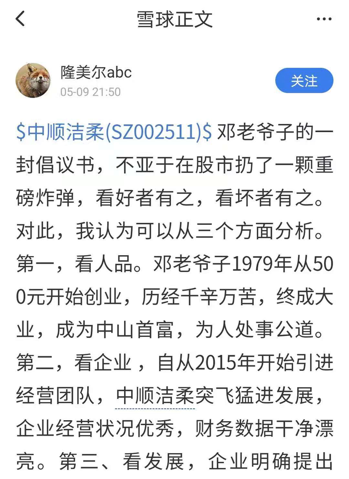 球友@隆美尔abc:第一看人品。邓老爷子1979年从500元开始创业,历经千辛万苦,终成大业,成为中山首富,为人处事公道。第二看企业,自从2015年开始引进经营团队,中顺洁柔突飞猛进发展,企业经营状况优秀,财务数据干净漂亮。第三看发展,企业明确提出“百年企业、千亿企业”的奋斗目标,随着四川和江苏项目的陆续投产以及个护产品的推广,极有可能在未来几年成为行业第一。从上述三点,我个人认同邓老爷子的观点,他是看好未来企业的发展格局,同时这一招也给新的经营团队增加了很大的压力和动力。