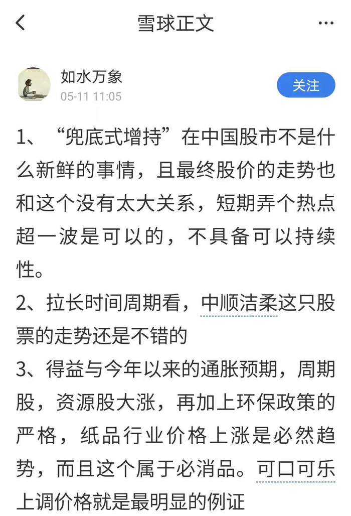 球友@如水万象:“兜底式增持”在中国股市不是什么新鲜的事情,且最终股价的走势也和这个没有太大关系,短期弄个热点炒一波是可以的,不具备可持续性。得益于今年以来的通胀预期,周期股,资源股大涨,再加上环保政策的严格,纸品行业价格上涨是必然趋势,一旦通胀概念过了,股价也就要回归正常估值。
