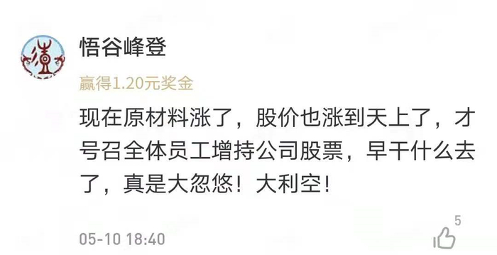 球友@悟谷峰登:现在原材料涨了,股价也涨到天上了,才号召全体员工增持公司股票,早干什么去了,真是大忽悠!大利空!