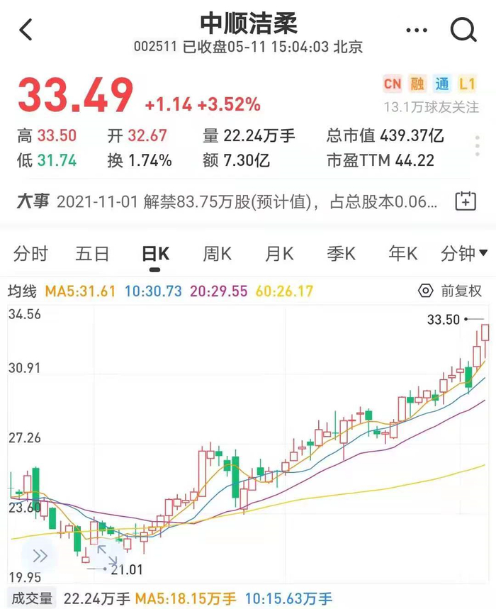 在老板喊出兜底增持之后,中顺洁柔股价连续上涨2日,昨天大涨7%,今天再度上涨3.5%,股价再创历史新高,市值突破430亿。