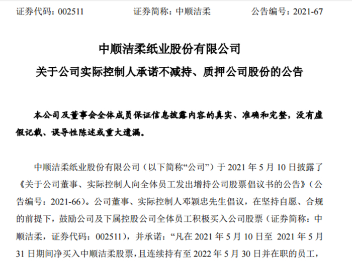 为了体现诚意,中顺洁柔实际控制人邓颖忠、邓冠彪、邓冠杰出具《承诺函》称:“自本承诺函签署日起至2022年5月30日止,不通过任何方式减持、质押本人直接、间接所持有的公司股份,包括承诺期间该部分股份因资本公积转增、派送股票红利新增的股份。若违反上述承诺,所得收益全部归公司所有。”