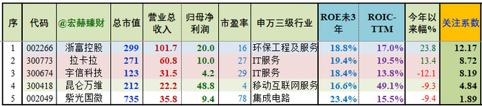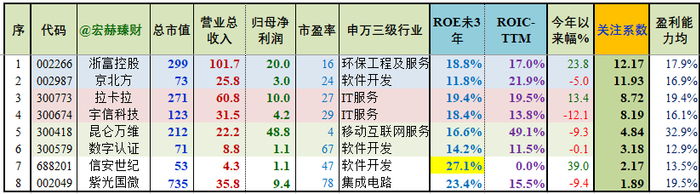 [注]:5-10分公司用红色底纹标出,意味着用宏赫关注系数模型选出的当前推文时点的优先关注(请注意这四个字,投资者还需对其深度研究,或参看我们护城河评级专栏是否有覆盖研究)的公司。市值、营收规模过小公司请谨慎对待。若时效久远,请联系honghe918微信定制最新时点表格。新股要注重盈利能力是否在融资后可持续。