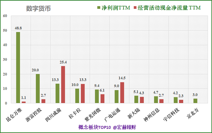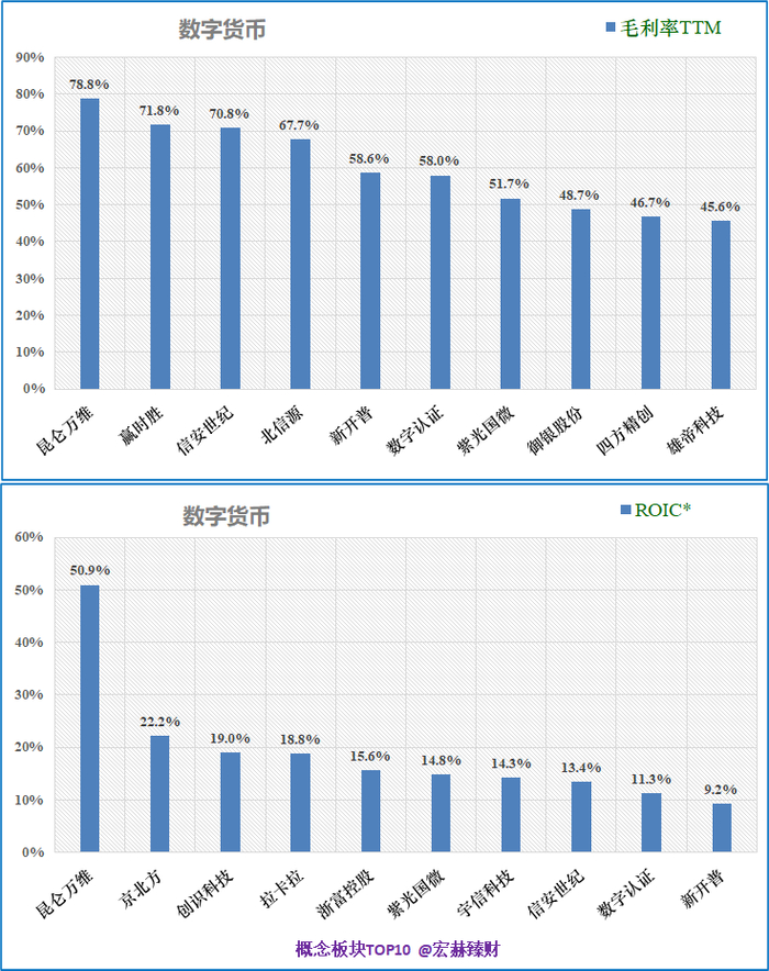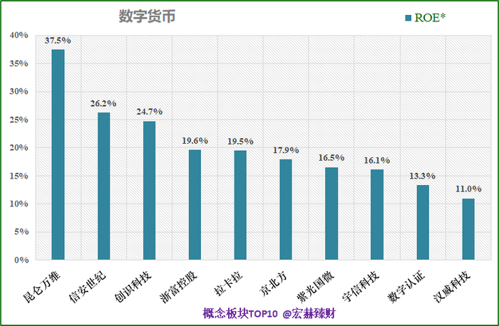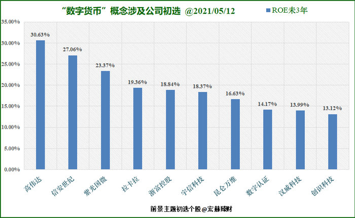 宏赫臻财根据行业特性,在53家“数字货币”概念涉及上市公司中,取此两指标均值大于12%的公司按照盈利能力排序如下,共计【8】家。(同时剔除了指标异常值)