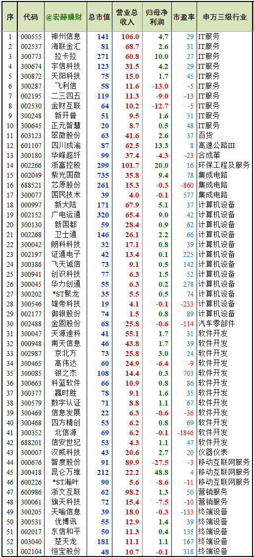 目前A股涉及“数字货币”概念的上市公司共有53家,部分财务指标前十如下: