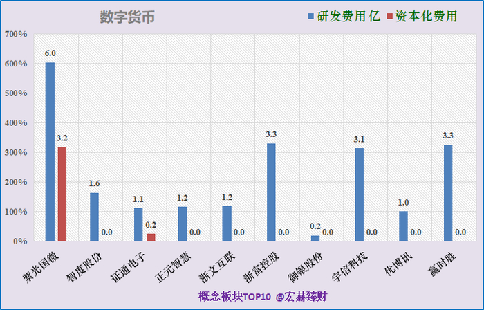 当前“数字货币”概念涉及公司研发费用前三:紫光国微6.0亿、智度股份1.6亿、证通电子1.1亿。